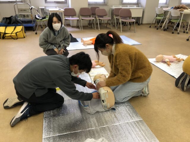 こども教育学部の2年生・3年生の希望者がこの講習を受け、幼児安全法支援員の資格を得るため、救急処置の知識と技術を学びました。