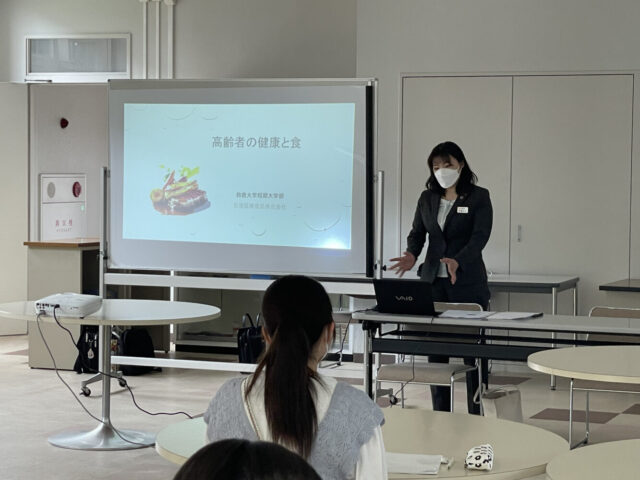 1回目の授業では、高齢者の健康と食をテーマに講義をしていただきました。食べることの意義、高齢者の身体的特徴、高齢者の健康・食に関する問題などを教えていただきました。特に「フレイル」についてたくさん教えていただき、次回は、今回学んだことを活かして献立作成について教えていただく予定となっています。