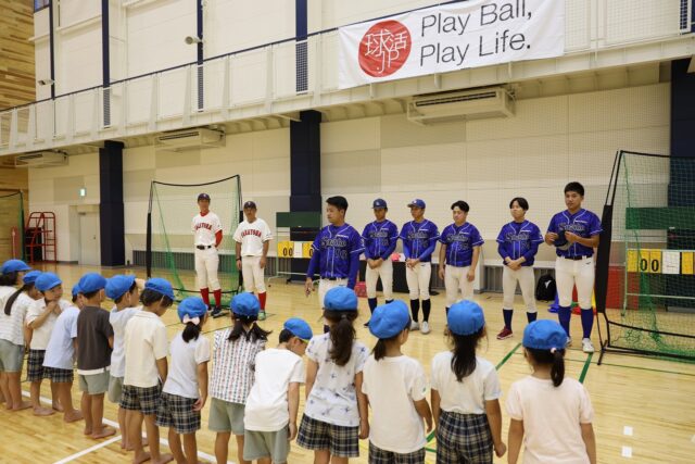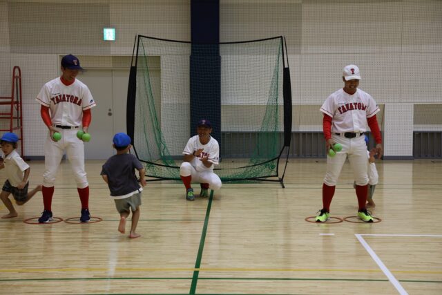鈴鹿大学国際地域学部、田中・竹田ゼミでは、野球界を盛り上げる取り組みとして「野球振興プロジェクト」を実施しています。7月28日(金)、鈴鹿大学体育館に幼児を招き、今期3回目の野球教室を開催しました。今回は、三重県の社会人野球チーム「三重高虎ベースボールクラブ」の松下代表、宮下選手、山之内選手にも特別講師としてお越し頂きました。同クラブの選手、硬式野球部学生からアドバイスを受けながら、投げる、捕る、打つ、走るなどの基本練習後に試合を行いました。野球教室の最後には、スポーツメーカー18社の企業が集まり、設立された一般社団法人野球・ソフトボール活性化委員会より、子どもたちにボールがプレゼントされました。
