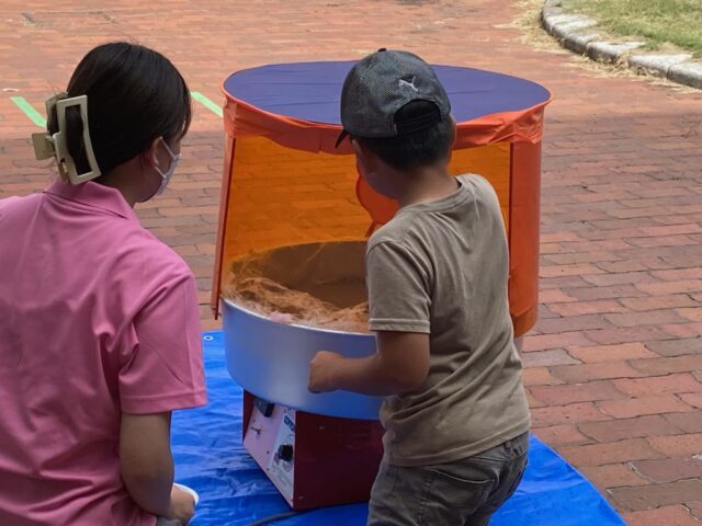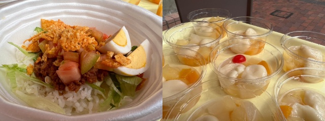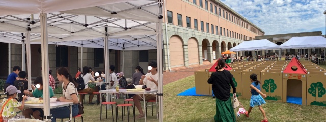 短期大学部食物栄養学専攻の学生が考案し、調理した「タコライス」「フルーツ白玉」をふるまい、中庭に設置した段ボール迷路、わたがし作りなど、地域のこども達とボランティア学生がふれあい、あたたかいつながりを届けることができました。