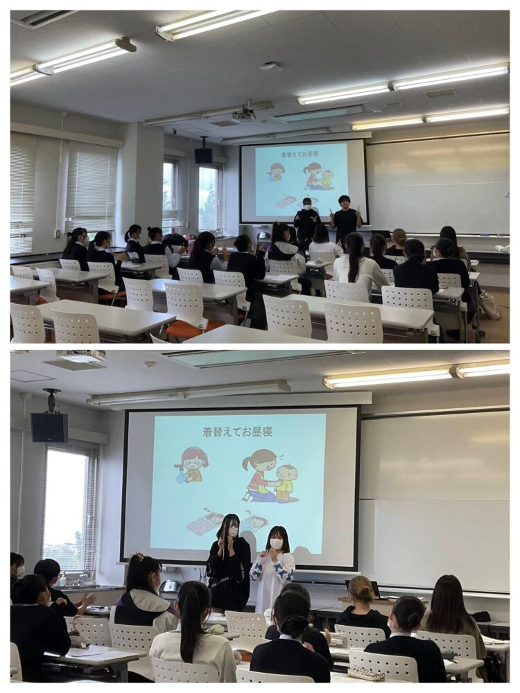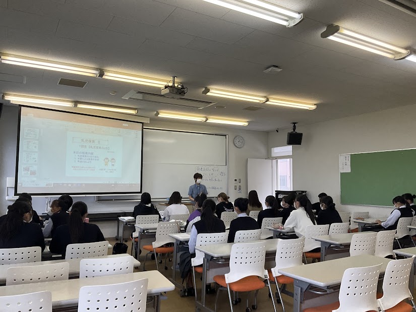 鈴鹿高校幼児教育系クラス3年生の皆さんを対象に、こども教育学部の市川理恵子先生が「乳児保育」の授業を行いました。この授業は、鈴鹿大学こども教育学部2年生も一緒に受けました。こどもの発達について0歳児から2歳児までのこどもの様子を映像を交えて、こども教育学部の市川先生が講義を行いました。