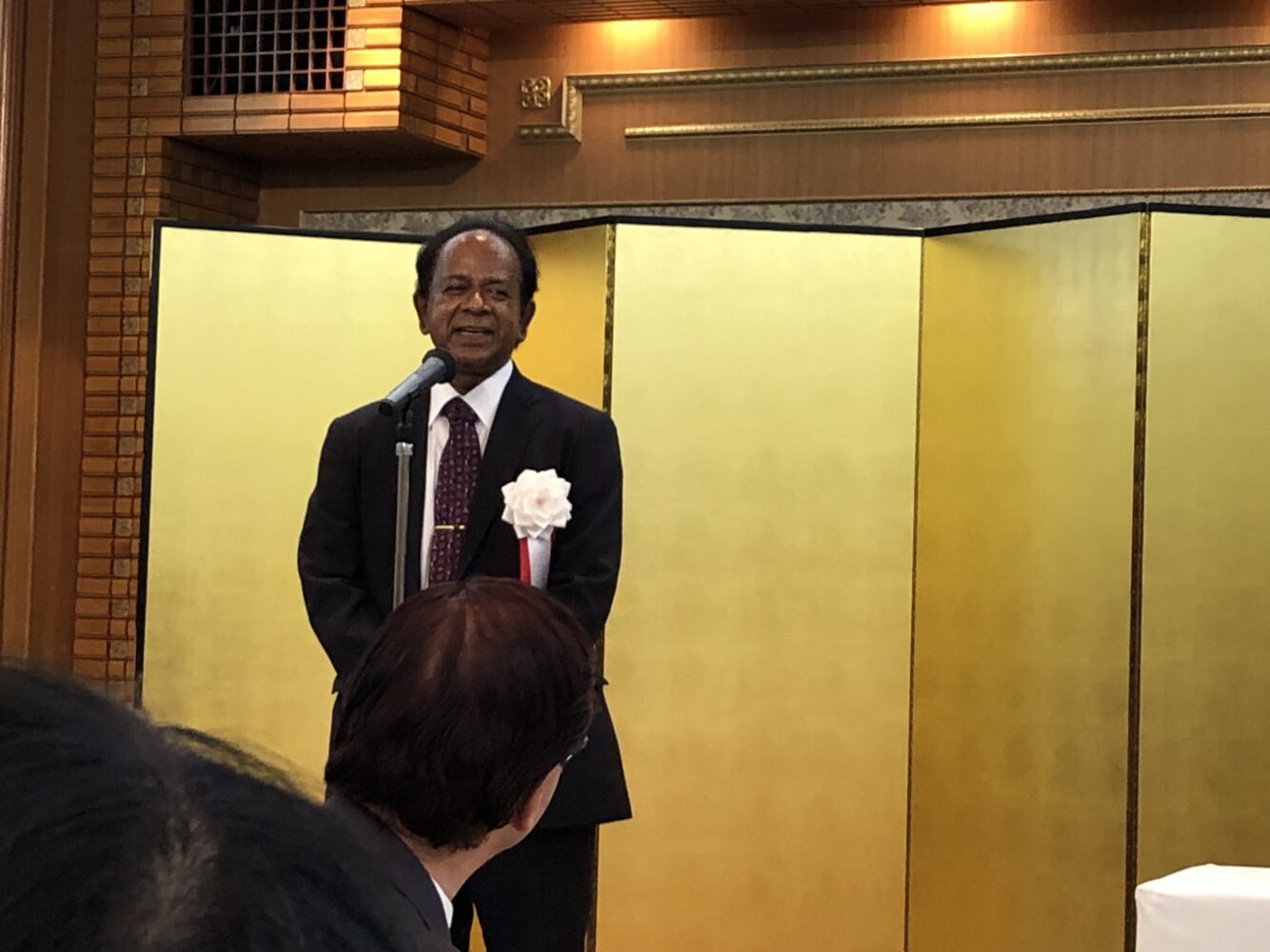 当日は国際協力機構(JICA)、学会、NPO、ボランティア組織、大学など、クマーラ教授の幅広い人脈を裏付け、明るく前向きなお人柄を慕う大勢の方がお祝いに駆け付けました。本学からは川又俊則学長および今光俊介副学長が出席しました。クマーラ教授は「日本とスリランカの相互理解の促進」の功績を称えられて受賞されましたが、実際の業績・功績は非常に多岐に渡ります。川又学長の来賓祝辞では、「セイロン瓜プロジェクト」、学生国際交流組織「WAI(ワイ)」、「鈴鹿国際大学 開発と文化研究センター(SIUDAC/シウダック)」の3点に絞り込んで、本学在職中のご活躍を称えました。