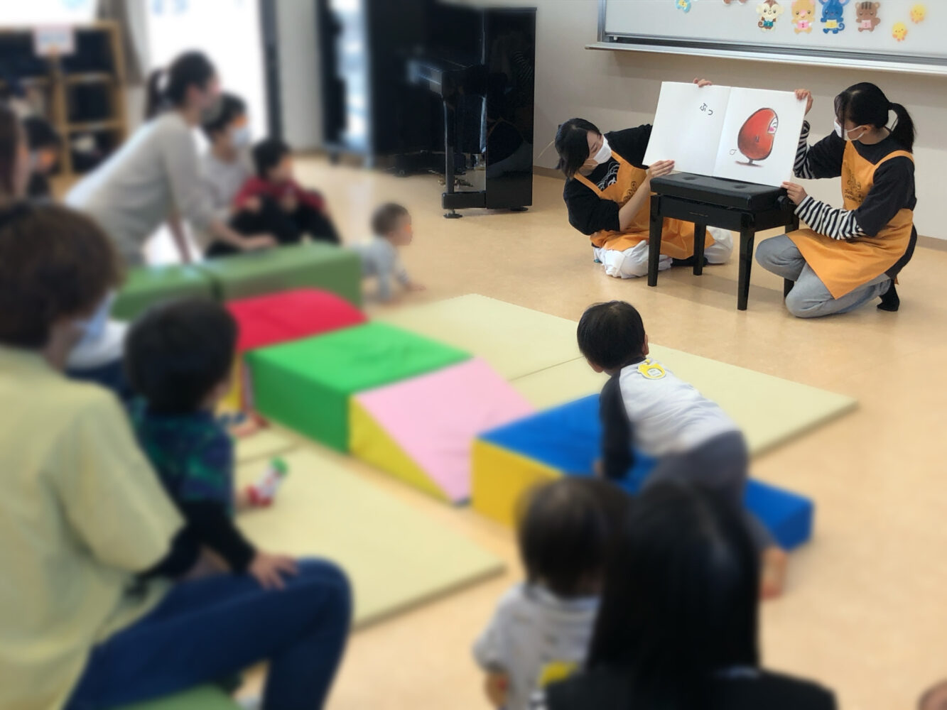 こども教育学部の2年生たちが広場の内容を企画し、実際に運営を行いました。室内にある、おもちゃでの遊びだけでなく、『はじまるよ、はじまるよ』の手遊びや『だるまさんが』の大型絵本をみて、いろんな恰好をしながら楽しみました。お別れの前にはお母さんの膝にのって、バスごっごをしてもらい、皆ニコニコでした。