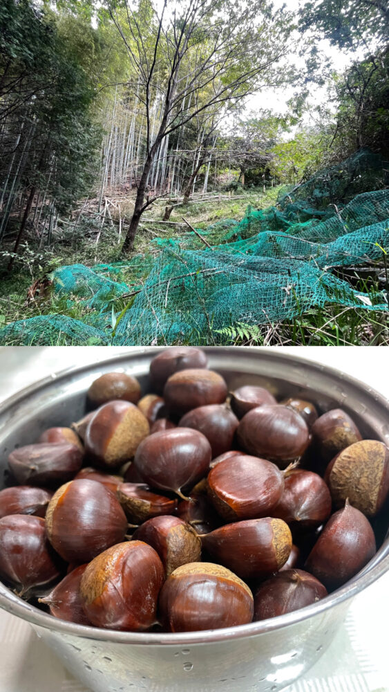 まず、栗の実を傷まないように、また収穫しやすいようにネットを敷きました。