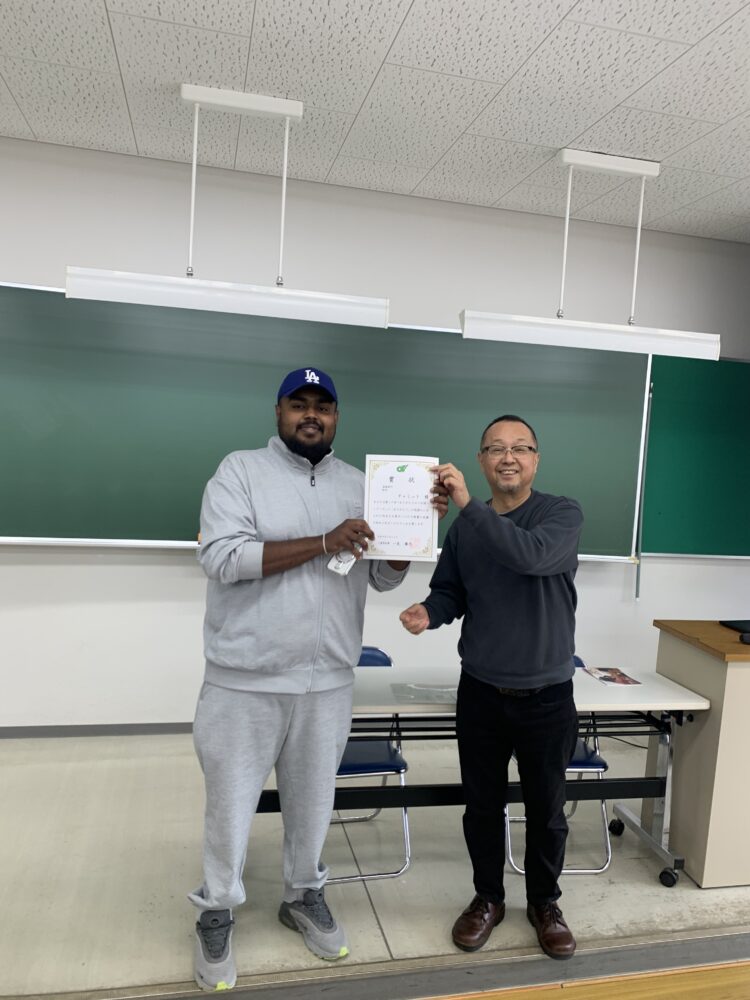 これを受け、令和8年4月13日には「国語読解表現法」第1回授業の冒頭にて表彰式を執り行い、賞状および作品集の授与を行いました。受賞した留学生は、これらをスリランカのご家族へ贈る予定であり、日頃の感謝の思いを言葉にして伝える姿勢は、周囲の学生にも良い影響を与えました。