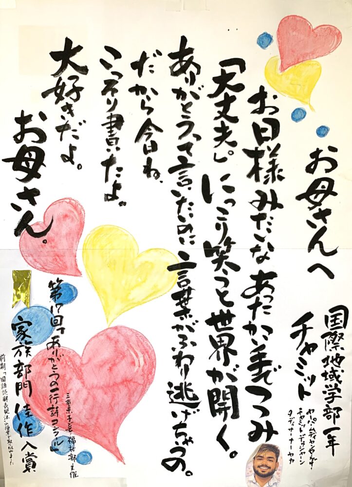 本学の授業「国語読解表現法」(令和7年度)において取り組んだ「ありがとうの一行詩」において、応募総数6,815点の中からスリランカ出身の留学生が家族部門で佳作を受賞しました。