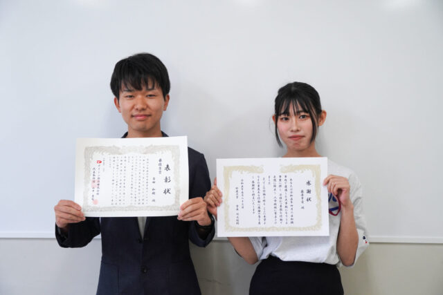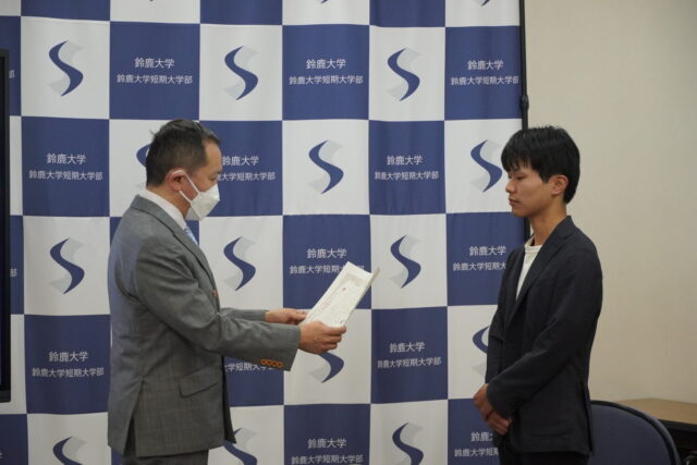 吉田和樹さん(こども教育学部4年生)は、ダイシン物流株式会社様主催のダイシンコンテストの最優秀賞に選ばれました。「私が大学で学んだことで将来どのように多文化共生社会に貢献できるのか」というテーマで、将来教育の現場に立つ者としての視点で小論文を書きました。 この他、優秀賞としてタパマカガデビクマリさん(国際地域学部4年生)、奨励賞として高子勇さん、バトライマノズさん、傅茜姸さん、パウデルマノジさん(共に国際地域学部4年生)が選ばれました。彼らを代表して吉田さんが川又学長から表彰状と記念品を手渡されました。