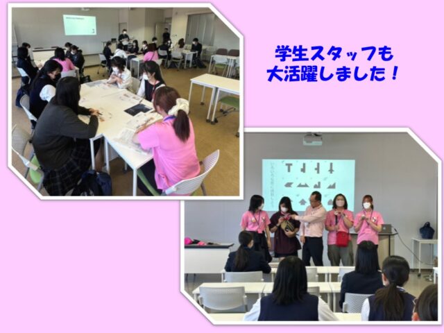 この模擬授業では、画用紙を切ってTパズルを作る活動が行われました。様々な形を作る楽しさと難しさを体験することができ、高校生から「遊びながら学ぶ楽しさを知ることができました。」「パズルは難しかったけど、できたときの達成感がすごくよかった!」などの感想をもらいました。