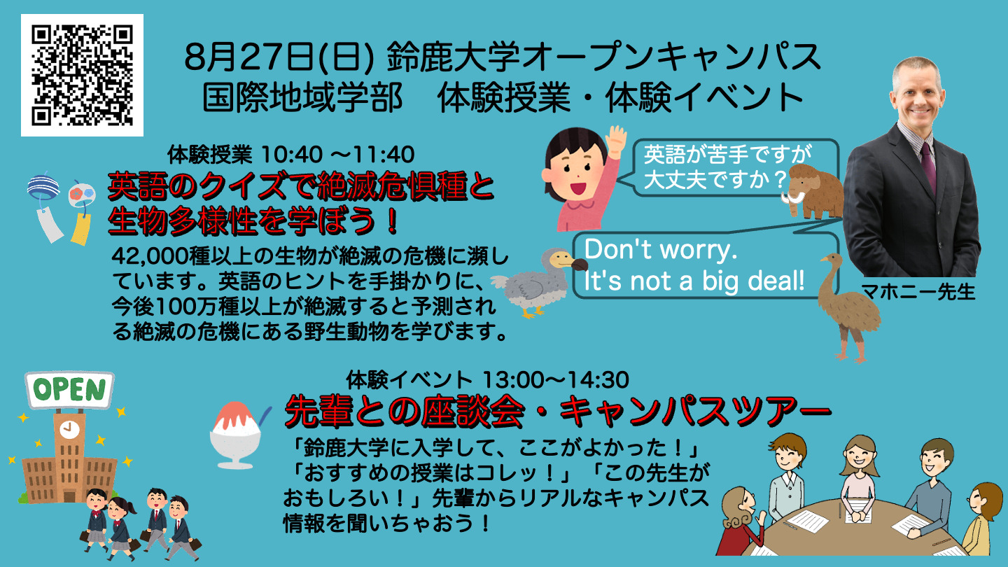 HOME > 大学からのお知らせ > お知らせ > 8月27日(日)オープンキャンパス 国際地域学部の体験授業と体験イベントを紹介します!