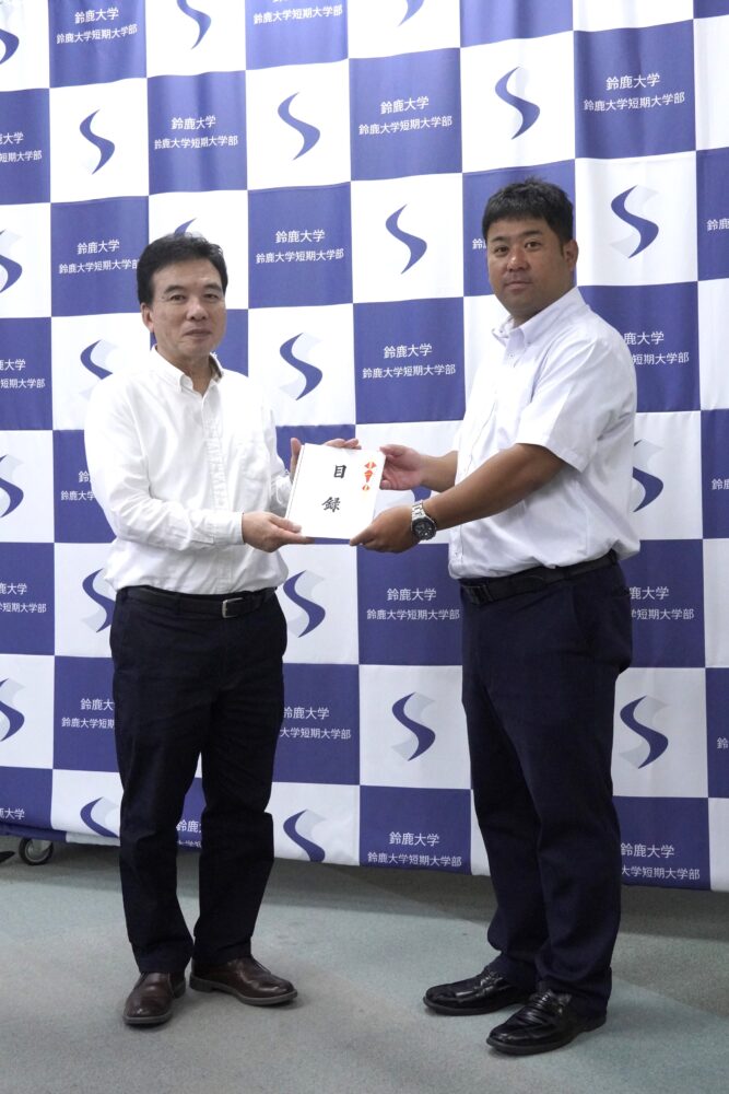 2025年10月01日 お知らせ 鈴風会(同窓会)からの寄付について(令和7年9月30日) 令和7年9月25日(木) 鈴鹿大学鈴風会(同窓会)様から今年度も寄付金(100万円)をいただきました。 同日、吉田会長にご参加いただき、目録贈呈式を執り行いました。 寄付金は、教育研究、施設設備の充実及び学生支援のため使わせていただきます。 ありがとうございました。