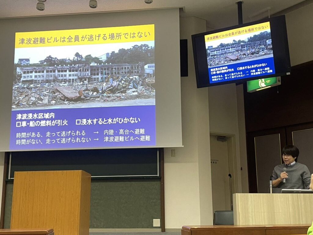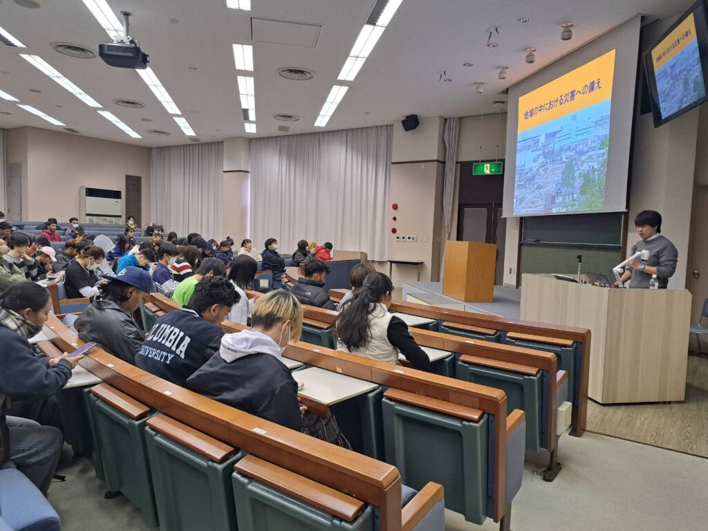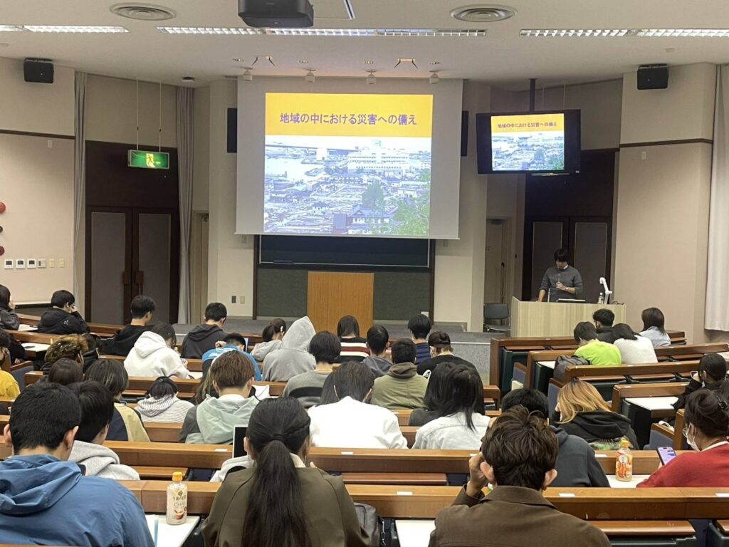 今回の講義では、県外・海外出身の学生が多い本学の特性を踏まえ、災害発生時の避難方法と日頃の備えについて学びました。また、本学が鈴鹿市災害ボランティアセンターのサテライト候補地であるため、その運営体制についても説明が行われました。